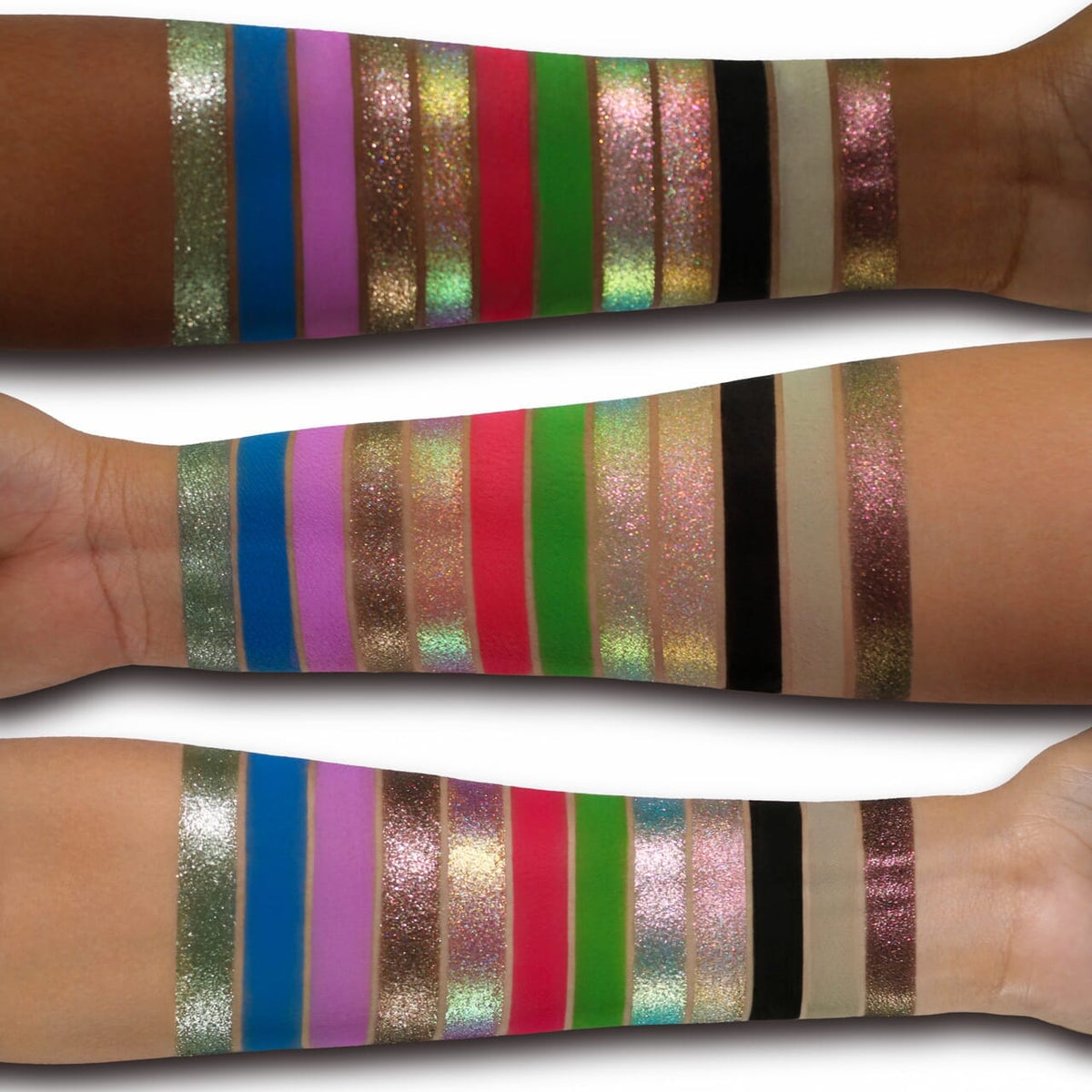 The Adept Cosmetics Vivette eyeshadow palette features variety of highly sparkly duochromes, multichromes, and intense shimmers, alongside two matte shades designed to complement the sparkle It's a vegan, talc-free, and BHT-free palette with a creamy formula that may be susceptible to movement during transit or when touched. The palette includes 14 shades, with a mix of shimmers, multichromes, and mattes that are designed to pair well together