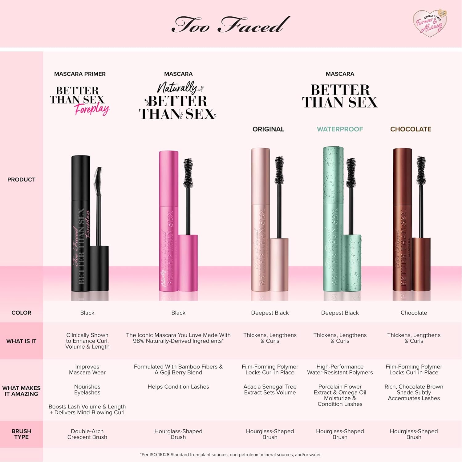 Too Faced Cosmetics Better Than Sex Mascara amplifies your lashes with volume and length to make your eyes pop. A uniquely shaped mascara brush, in the form of an hourglass, separates evenly coats every lash without leaving any clumps. Acacia senegal tree extract nourishes and gives the appearance of thicker-looking lashes. Black shade.