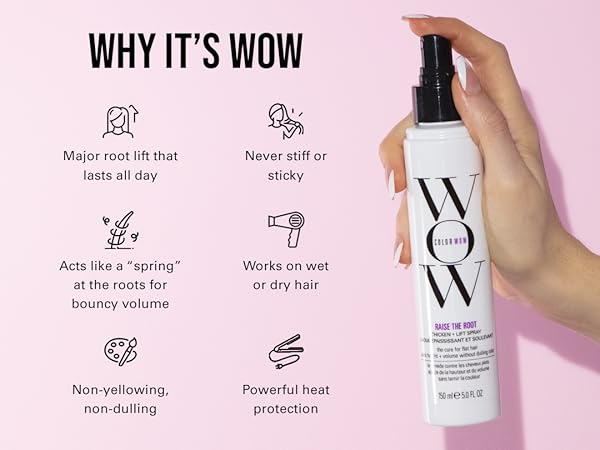 Color Wow Raise the Root Thicken & Lift Spray is a hair styling product that adds volume and root lift to hair. Provides all-day root lift and volume,Doesn't darken or yellow hair, Protects hair from heat damage,A versatile product that can be used to refresh styles,Free from stiffness, stickiness, and crunch,Spray onto damp or dry hair, focusing on the roots,Style as desired,Blow dry for lasting results