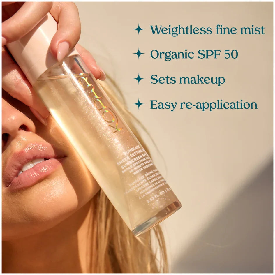 The Kopari Beauty Sunglaze Sheer Setting Mist Sunscreen SPF 50 (75ml) is an ultra-fine face mist that protects skin from UVA/UVB rays with a glimmering finish.